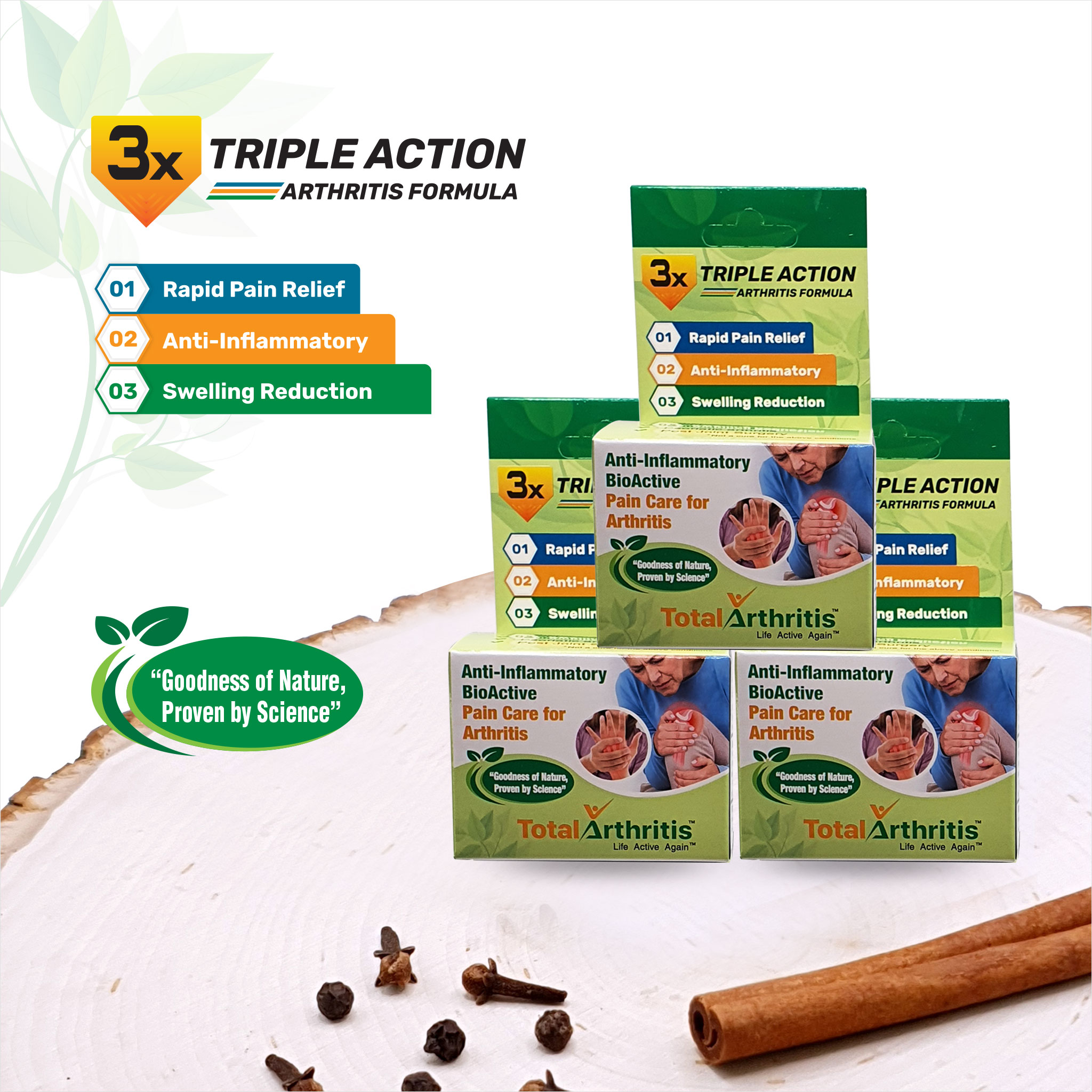 TotalArthritis is a unique triple action formula that addresses all three conditions simultaneously: immediate pain relief, Anti-Inflammation for long-term pain management and reducing swelling that is caused due to inflammation.